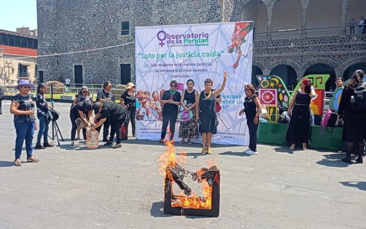 La protesta, convocada por el Observatorio de Paridad y Violencia Política de Morelos bajo el lema “Luto por la Justicia Caída”, incluyó un minuto de silencio y la quema de una urna negra en señal de inconformidad.