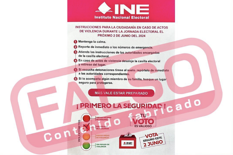 Falso que el INE haya emitido un “instructivo” con medidas a tomar en caso de presentarse actos de violencia durante la jornada electoral. Este instructivo publicado a nombre del organismo electoral es falso, ya que afirman “el INE trabaja activamente con las instancias de seguridad para garantizar elecciones en paz.