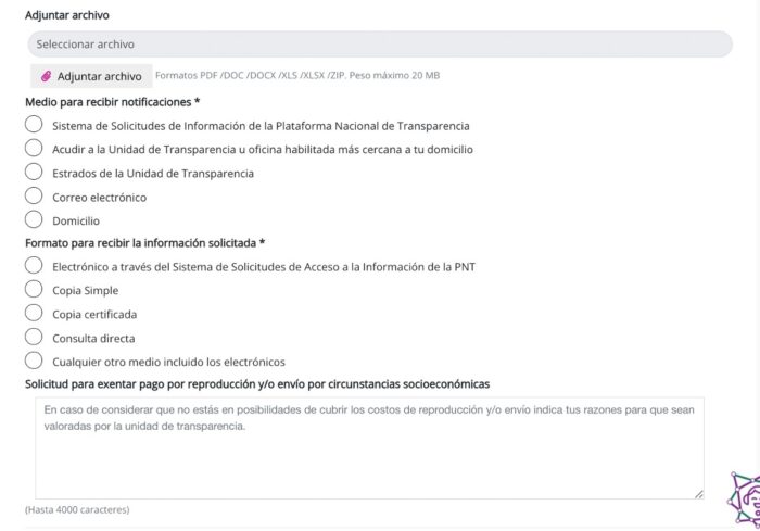 9. En el recuadro “Solicitud de información” se debe escribir con claridad y detalladamente la información que se pide. Se pueden escribir hasta 4,000 caracteres. En caso de ser necesario, se puede adjuntar un archivo de texto de hasta 20 megabytes en formato PDF, DOC, DOCX, XLS, XLSX o ZIP.