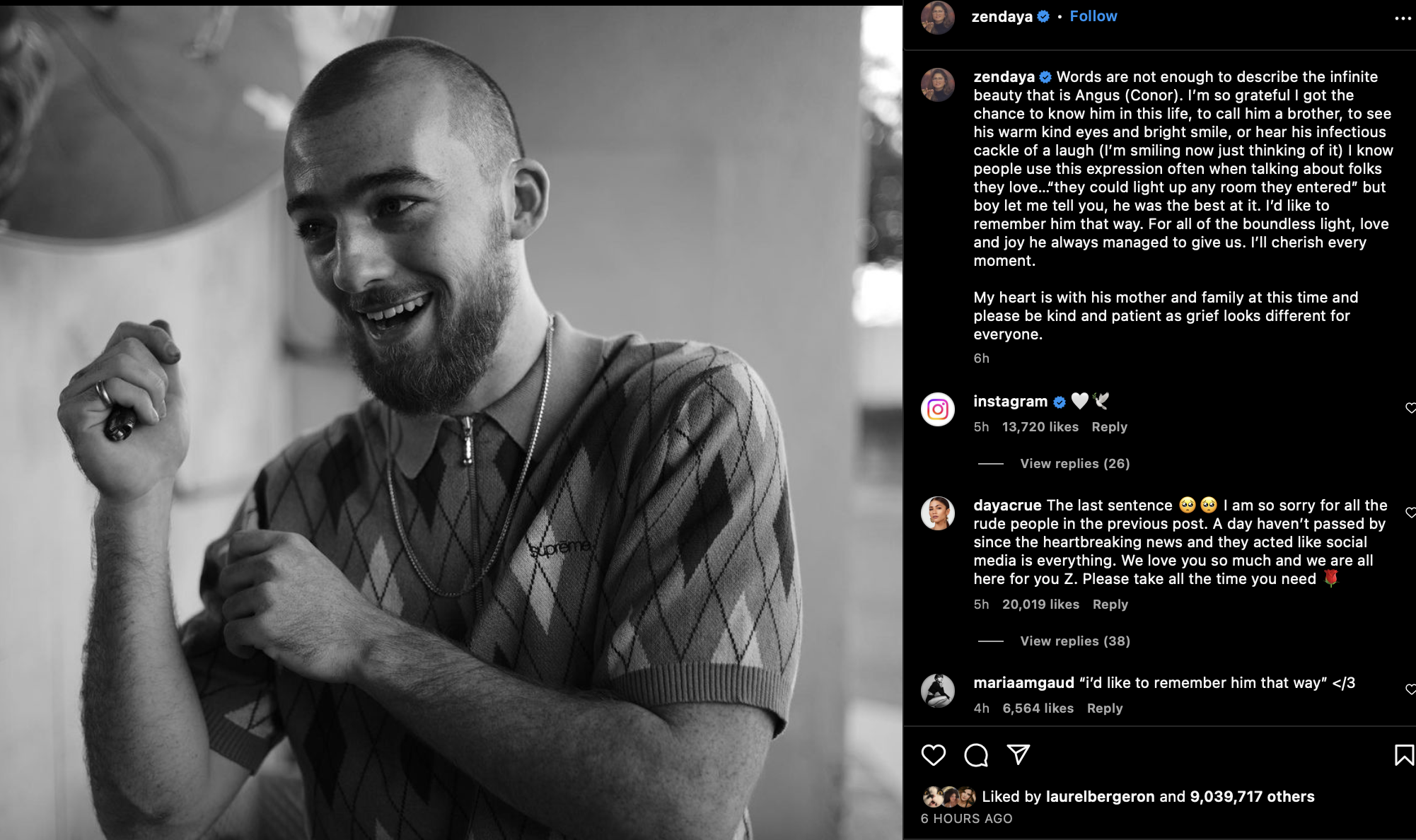 “Sé que la gente utiliza esta expresión a menudo cuando habla de sus seres queridos. (…) Pero déjenme decirles que él era el mejor en eso. Me gustaría recordarlo así. Por toda la luz sin límites, el amor y la alegría que siempre consiguió darnos”, añadió la también protagonista de “Spider-Man: No Way Home”.