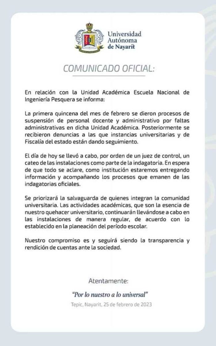 “El día de hoy se llevó a cabo, por orden de un juez de control, un cateo de las instalaciones como parte de la indagatoria. En espera de que todo se aclare, como institución estaremos entregando información y acompañando los procesos que emanen de las indagatorias oficiales.”.