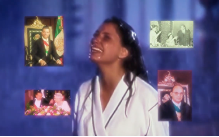 Con un zoom al rostro de la ex primera dama, Pedro Reséndez traslada al espectador 20 años atrás. Y en el segundo 30 de “Dios te salve mi reina”, presenta a una Angélica Rivera, en su papel como Regina Villareal en la novela “La dueña” de 1995, llorando bajo la lluvia; mientras un juego de transiciones coloca a Peña Nieto a la par del ex presidente Luis Echeverría.