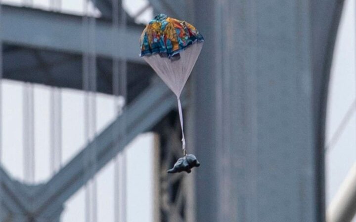 Una “lluvia” de elefantes de juguete en paracaídas cayó desde las azoteas de una pintoresca calle del barrio de Dumbo, en Brooklyn (Nueva York).