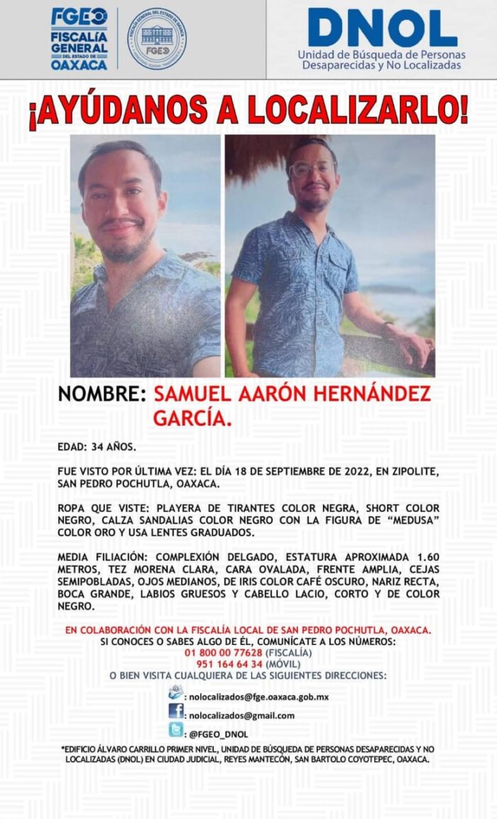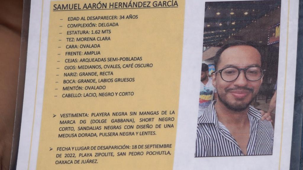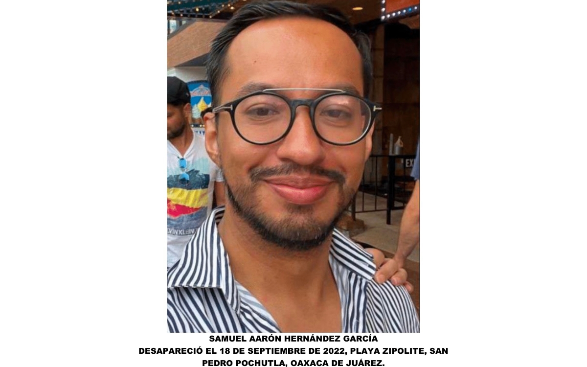 Oaxaca, Oax.- Lo que inició como un viaje de placer terminó en pesadilla para la familia de Samuel Aarón Hernández García, joven de 34 años que viajó de la Ciudad de México a Zipolite, Oaxaca, donde desapareció desde hace 11 meses.