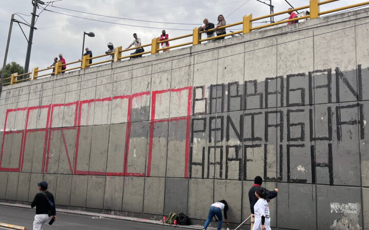 Otra de las fotografías que más llamó la atención fue la capturada por el periodista Alexis Pavón, mismo capturó la leyenda “Harfuch Genocida” en otro de los muros del paso a desnivel de Eje Central.