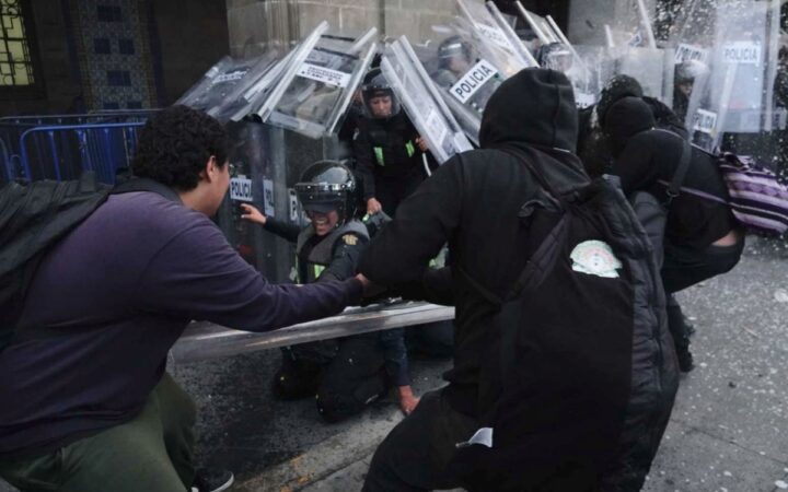 Detalló que en el Zócalo capitalino, las personas encapuchadas rompieron vidrios con diversos objetos y lanzaron artefactos explosivos hacia el edificio del Gobierno de la Ciudad de México.