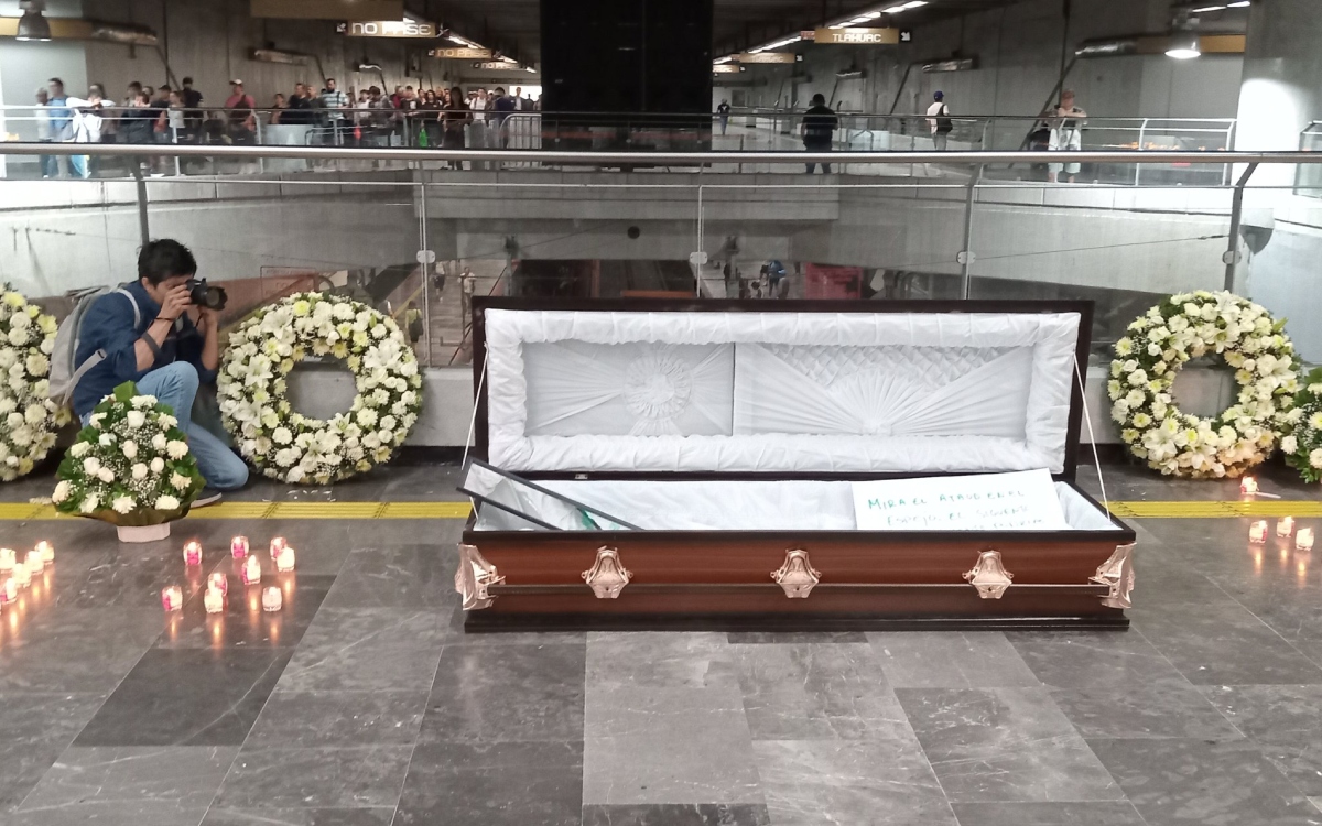 Entre flores fúnebres y veladoras, los protestantes colocaron un féretro con un espejo en el interior, que refleja a los usuarios del transporte público que se asomen, junto con una cartulina que dice “el siguiente podrías ser tu”. Colgada en los barandales, también se colocó una lona con el siguiente mensaje: