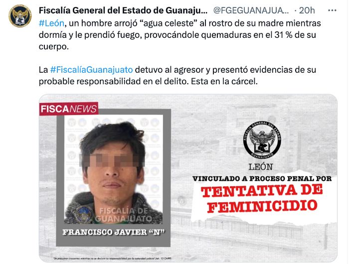 Según la investigación de la Fiscalía de Guanajuato, Francisco Javier ‘N’, hijo de la víctima, ingresó a la habitación y roció “agua celeste”, un solvente utilizado en la industria del calzado, sobre el cuerpo de su madre mientras ella dormía. Posteriormente, le arrojó un cerillo y prendió fuego.