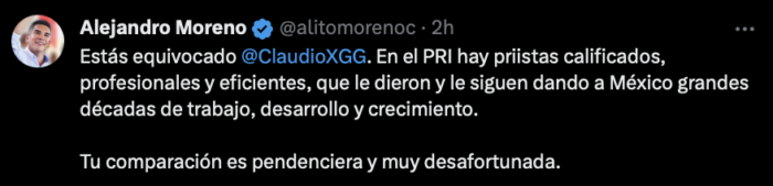 “Estás equivocado Claudio X. En el PRI hay priistas calificados, profesionales y eficientes, que le dieron y le siguen dando a México grandes décadas de trabajo, desarrollo y crecimiento. Tu comparación es pendenciera y muy desafortunada”.