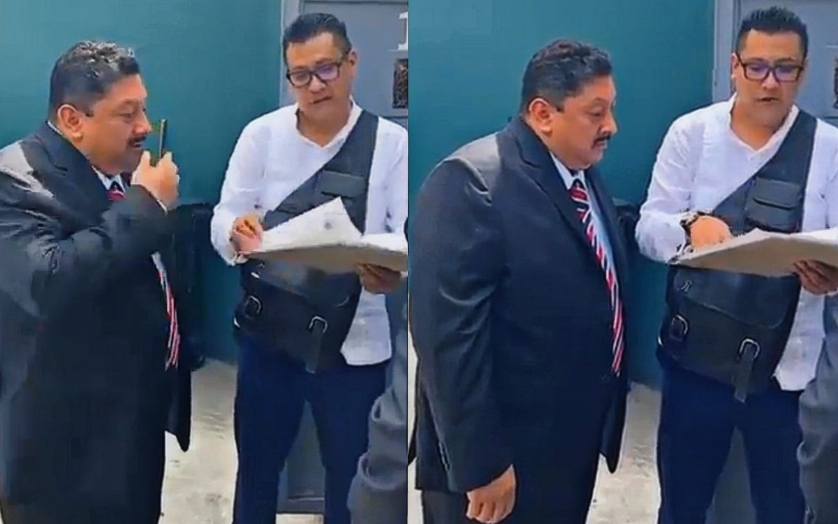 “Mira, aquí estoy compañero, nada más me la puedes pasar (la orden de aprehensión) nada más para que me la enseñes y ya me voy contigo”, le pide el fiscal morelense a la persona a través de una pequeña puerta.