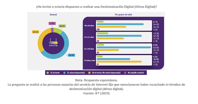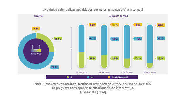 La encuesta también destaca que el 25.6% de los usuarios de internet fijo han dejado de realizar actividades debido a su conexión constante. Este porcentaje es más alto entre las personas más jóvenes. Además, el 14.1% ha intentado reducir su tiempo en línea, implementando acciones como establecer horarios para revisar aplicaciones o desactivar notificaciones.