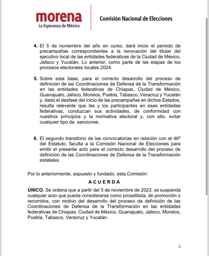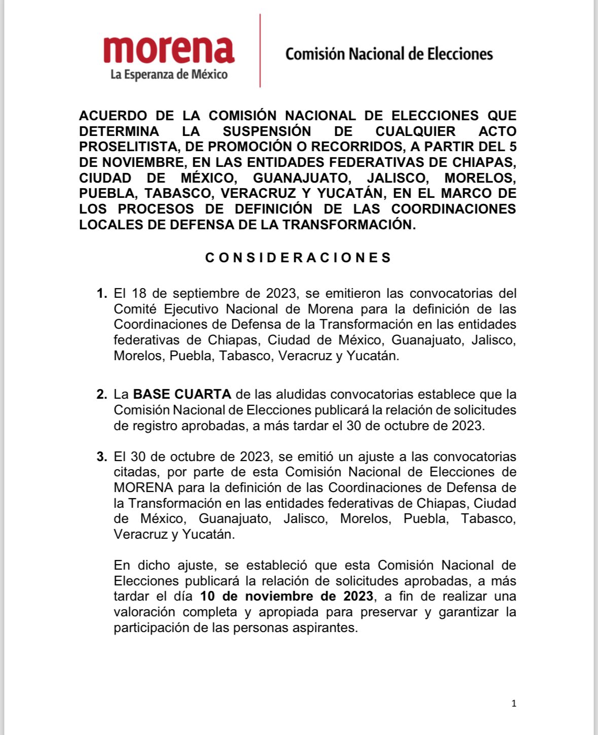 Morena, a través de la Comisión Nacional de Elecciones, ordenó la suspensión de cualquier acto proselitista a partir de este domingo 5 de noviembre en las nueve entidades donde se renovarán gubernaturas en 2024.