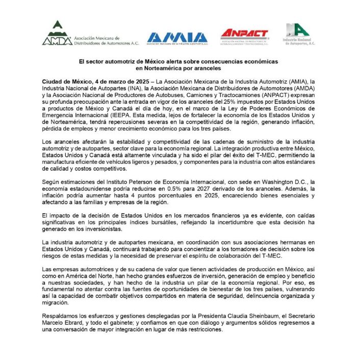 A través de un comunicado conjunto, las asociaciones clave de la industria, incluyendo la Asociación Mexicana de la Industria Automotriz (AMIA) y la Industria Nacional de Autopartes (INA), junto con otros organismos representativos como la Asociación Mexicana de Distribuidores de Automotores (AMDA) y la Asociación Nacional de Productores de Autobuses, Camiones y Tractocamiones (ANPACT), expresaron su preocupación ante esta situación.