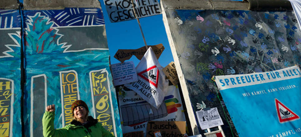 Ciudadanos berlinenses y artistas se manifiestan en contra de una constructora que pretende levantar edificios de lujo en el lugar que ocupa el 'East Side Gallery’, un fragmento del muro considerado un espacio de libertad de expresión.