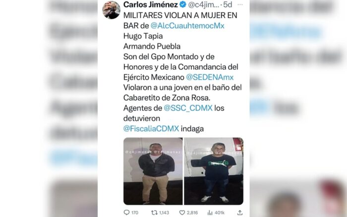 Por otro lado, el periodista Carlos Jiménez filtró imágenes de dos sujetos identificados como Hugo ‘N’ y Armando ‘N’ quienes presuntamente fungen como militares y habrían abuso sexualmente de una mujer dentro del Cabaretito.