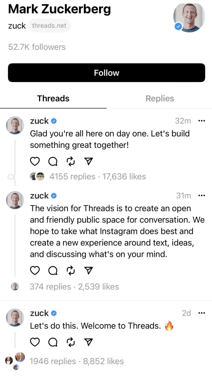 Las primeras publicaciones de Mark Zuckerberg en Threads; ¿ya la instalaste?