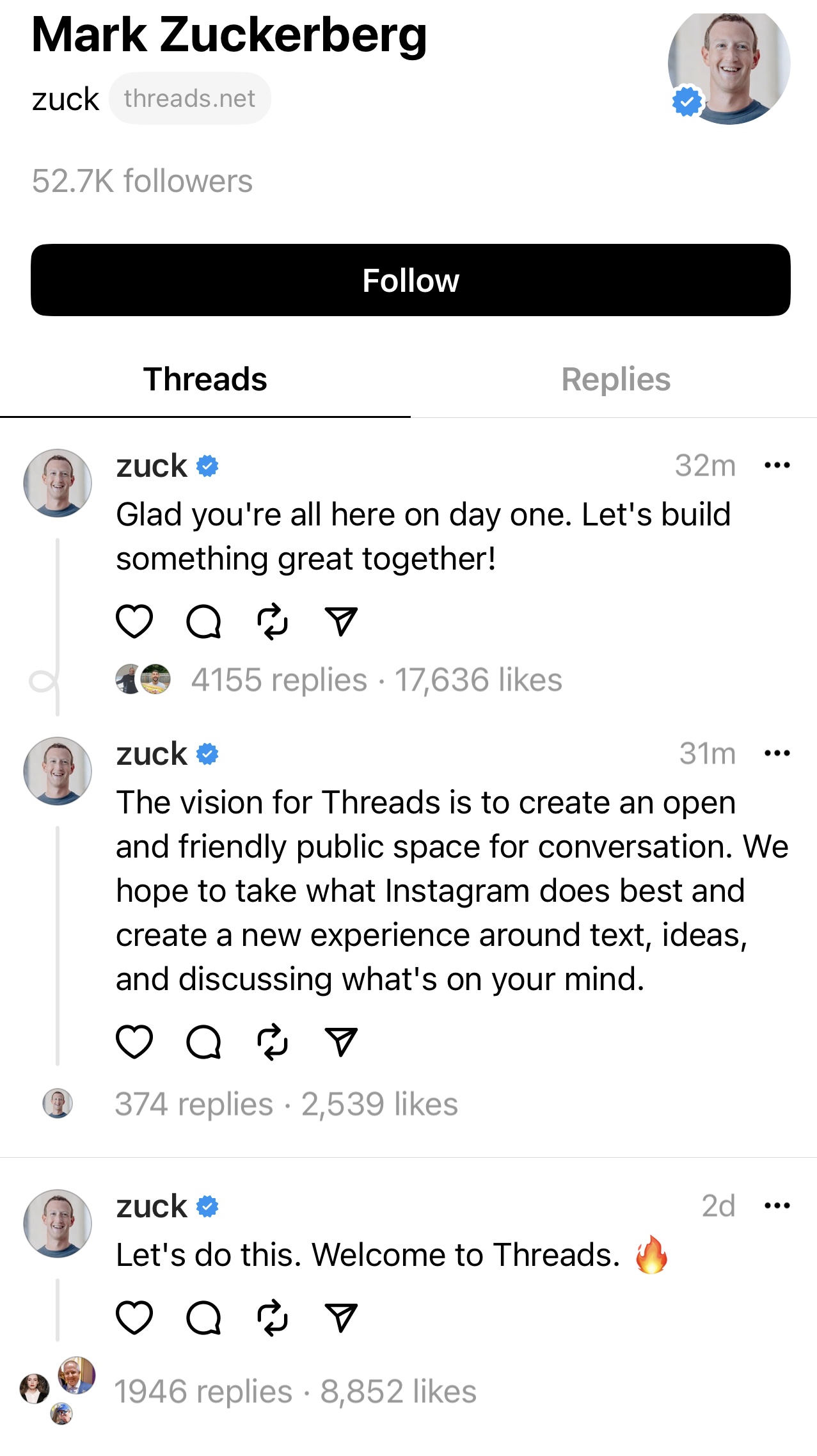 Dos días antes, cuando aún no había sido lanzado Threads, el empresario publicó otro mensaje: “Hagámoslo. Bienvenidos a Threads”.