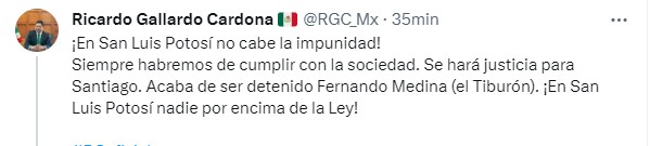 En su cuenta oficial de ‘X’ (Twitter) Ricardo Gallardo anunció la aprehensión y garantizó que se hará justicia para Santiago.