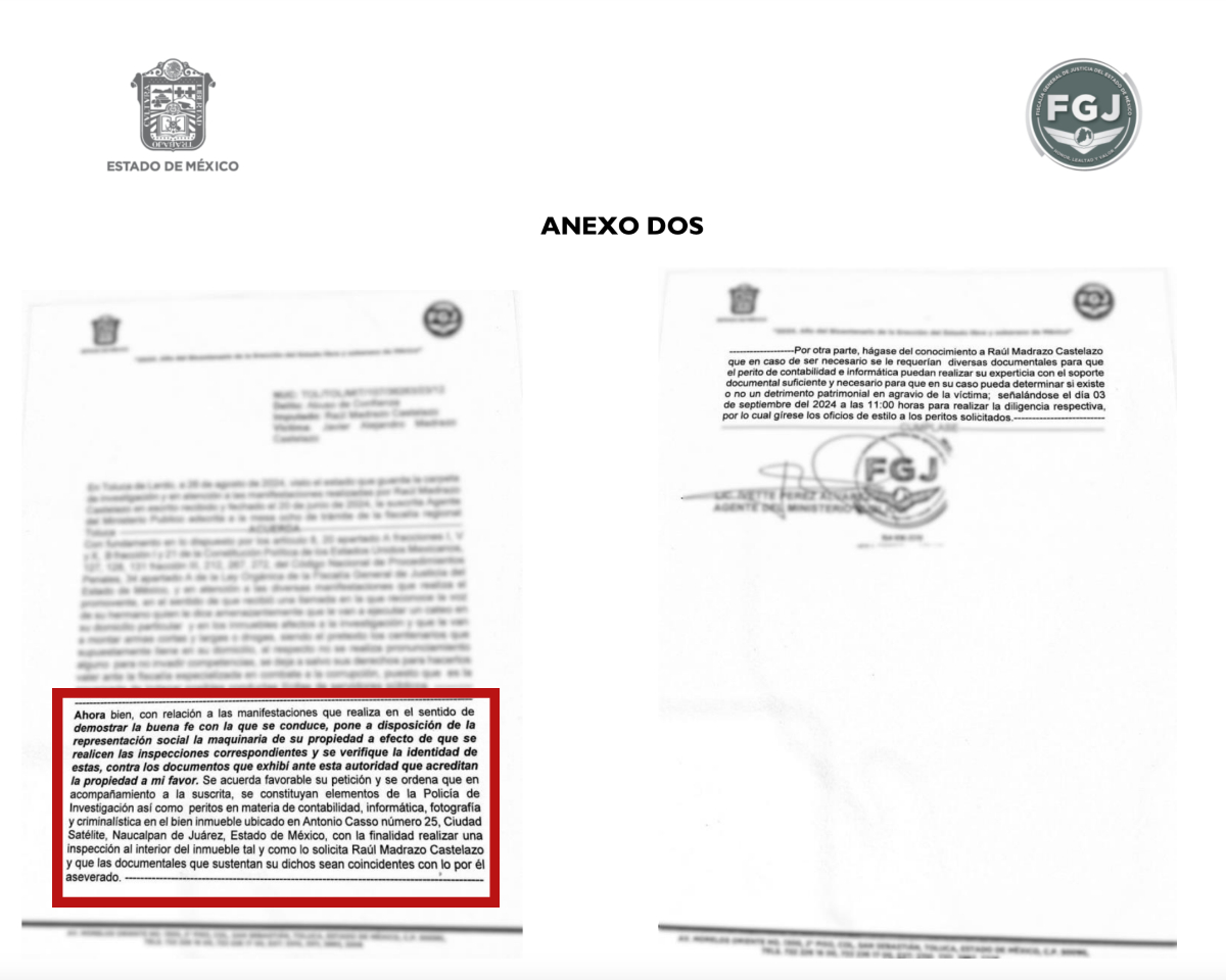 Mediante una carta enviada a Aristegui Noticias, para ejercer el derecho de réplica, la Fiscalía mexiquense agregó que derivado de dichas denuncias ha realizado diversos actos de investigación, incluyendo las comparecencias de ambas partes, destacando que el pasado 21 de junio del 2024, la defensa de Raúl Madrazo y el propio empresario acordaron una visita legal a su domicilio para una inspección de los documentos con los cuales acreditó la propiedad de la maquinaria y de posesión del inmueble en disputa.