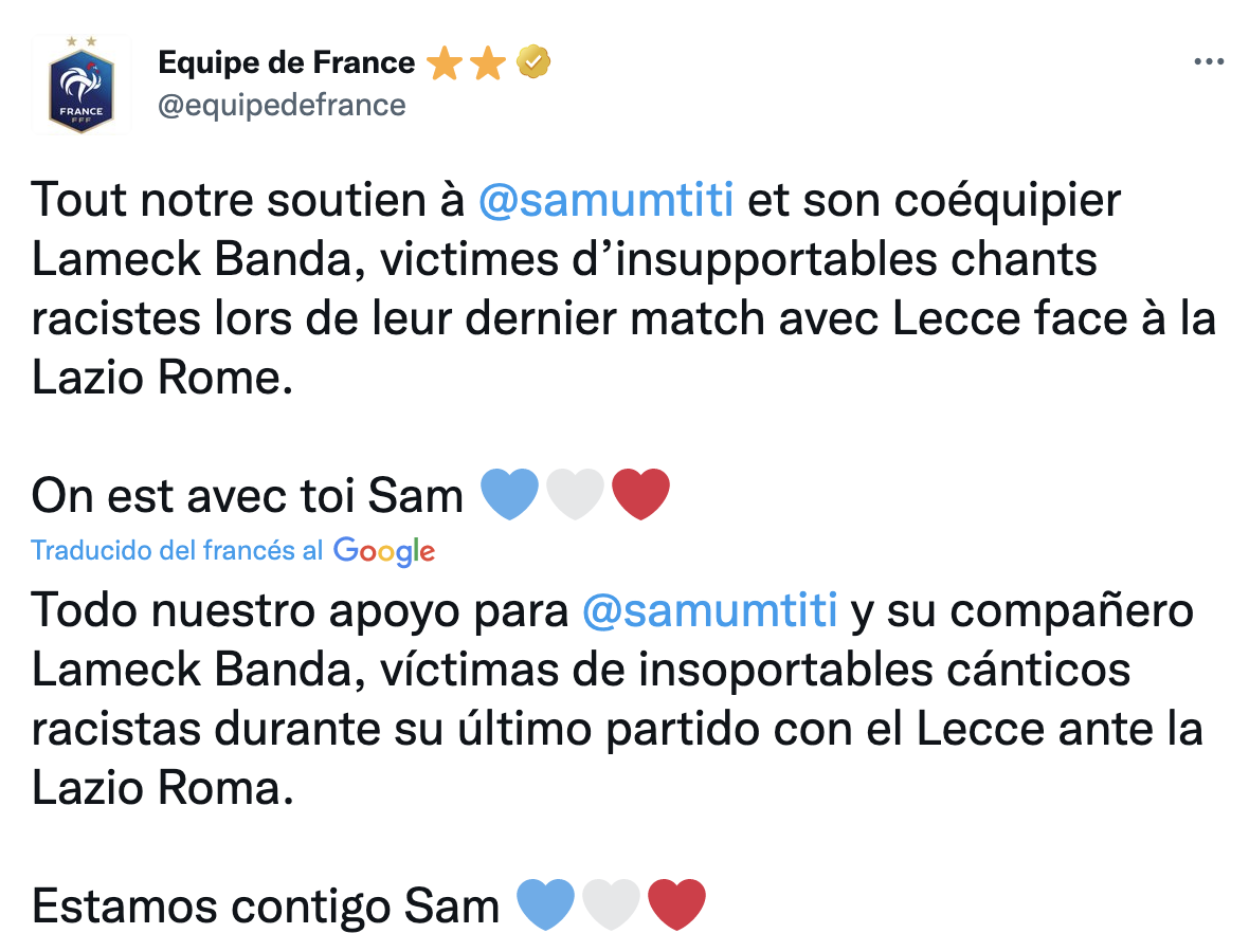 El FC Barcelona da todo su apoyo a Samuel Umtiti y ratifica su total oposición a cualquier signo de violencia, racismo, xenofobia e intolerancia.