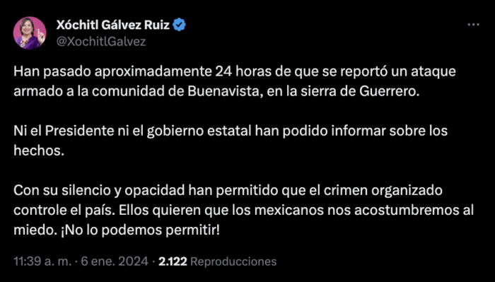 “Han pasado aproximadamente 24 horas desde que se reportó un ataque armado a la comunidad de Buenavista, en la sierra de Guerrero“, escribió Gálvez en X, antes Twitter.