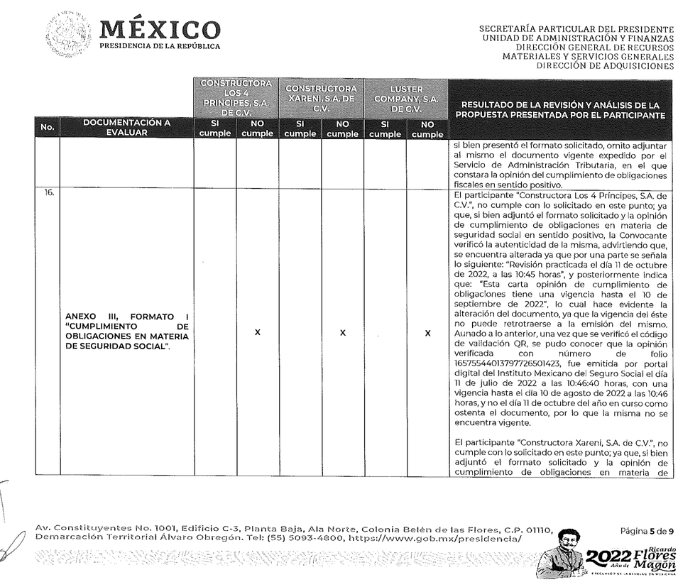 También se detectó que Constructora Los 4 Príncipes alteró el formato de cumplimiento de obligaciones patronales ante el Infonavit. “La convocante (la Presidencia) verificó la autenticidad de la misma, advirtiendo que se encuentra alterada, ya que por una parte el documento señala como fecha de emisión el 11 de octubre de 2022; no obstante, una vez que se verificó el código de validación QR, se pudo conocer que la constancia fue emitida el 1 de julio”.