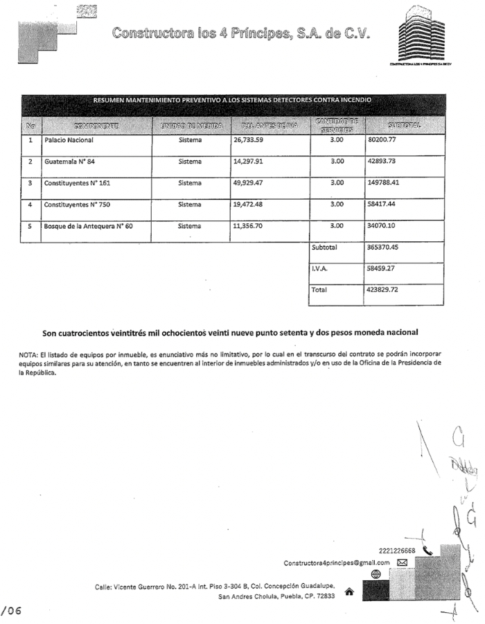 Cinco días después de haberse entregado las invitaciones, las tres empresas elegidas en el procedimiento presentaron su propuesta para dar mantenimiento a los sistemas detectores de fuego en Palacio Nacional, así como en otros cuatro inmuebles que están a cargo de la Oficina de la Presidencia, en la calle Guatemala 84, en avenida Constituyentes 161 y 750, y en la residencia ubicada en Bosque de la Antequera 60, en Huixquilucan, que fue la casa del ex presidente Ávila Camacho.