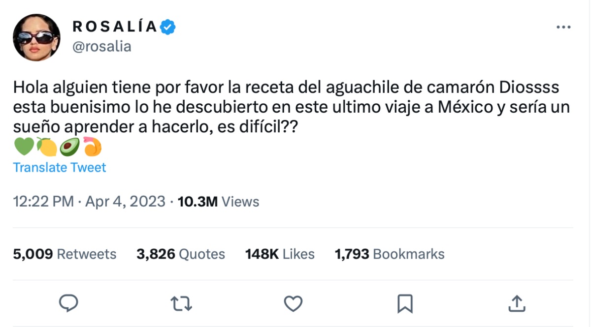 “Hola alguien tiene por favor la receta del aguachile de camarón. Diossss, está buenísimo lo he descubierto en este último viaje a México y sería un sueño aprender a hacerlo, es difícil??”, publicó Rosalía a través de su cuenta de Twitter.