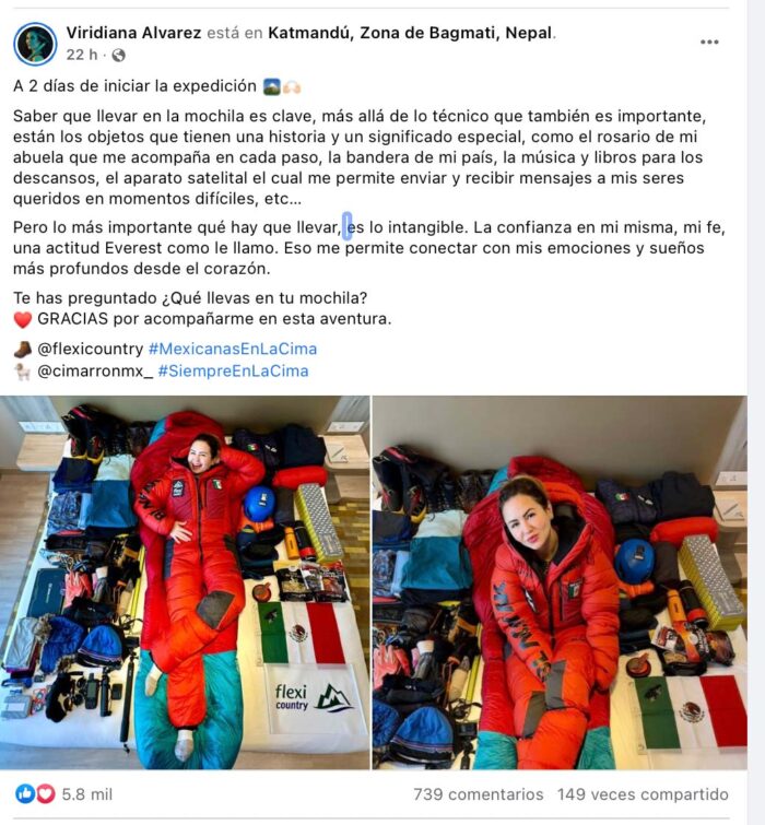Álvarez Chávez subió una fotografía donde se deja ver alegre, rodeada de sus objetos más importantes y la mochila con la que llegará al pico del Everest.