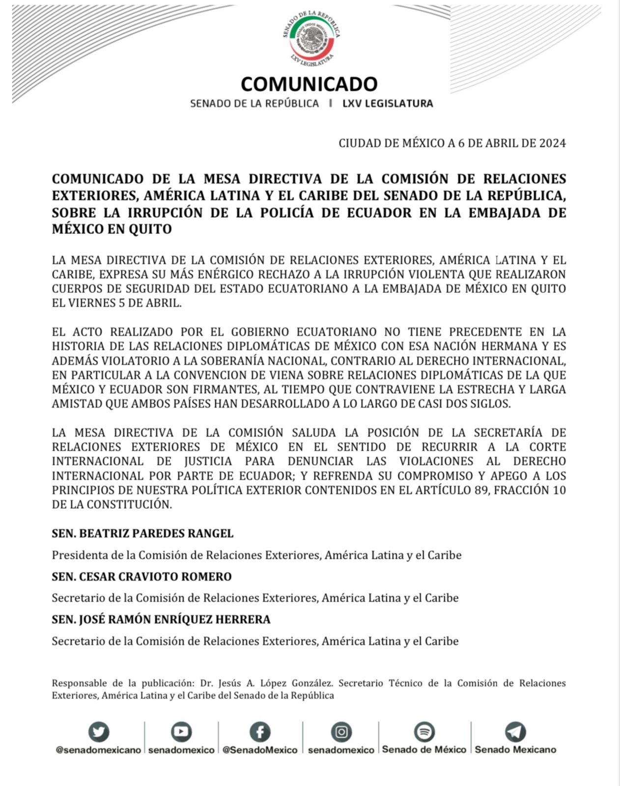 La Mesa Directiva de la Comisión de Relaciones Exteriores, América Latina y el Caribe, expresó su “más enérgico rechazo a la irrupción violenta que realizaron cuerpos de seguridad del estado ecuatoriano a la embajada de México en Quito el viernes 5 de abril”, a través de un comunicado.