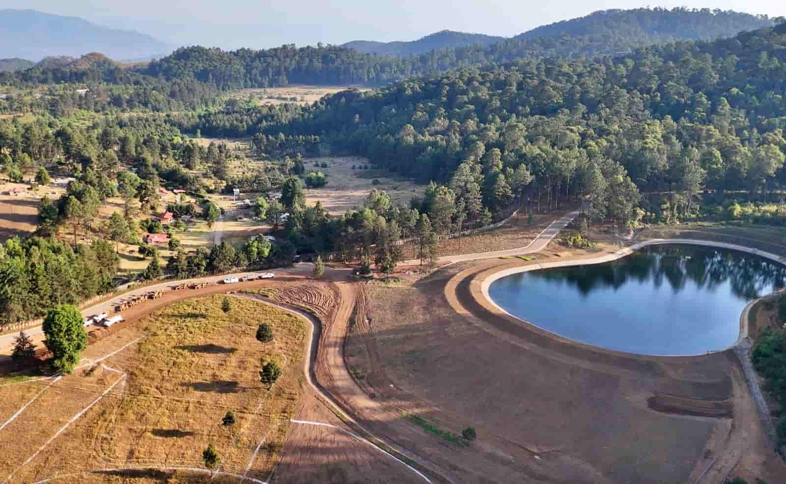 Colindante con estas dos comunidades, se impone el “Rancho San Jorge”. Afuera, policías municipales custodian el lugar a bordo de una patrulla. En su interior, imágenes aéreas obtenidas por www.evlyn.online, revelan una contrastante abundancia de agua contenida en gigantescas presas que, por sus grandes dimensiones, más bien parecen lagos quietos rodeados de tierra firme. En ellos, la luz del sol penetra y la sombra del bosque mesófilo de montaña propio de esta región, se refleja.