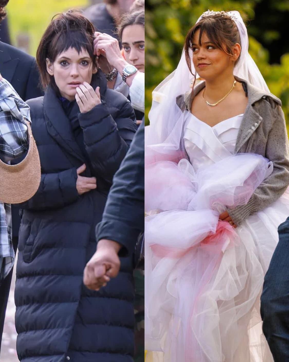 En las imágenes difundidas en redes sociales se observa a Jenna Ortega con lo que parece ser un vestido de boda; Winona Ryder lucía una chamarra color negra que le cubría hasta piernas.