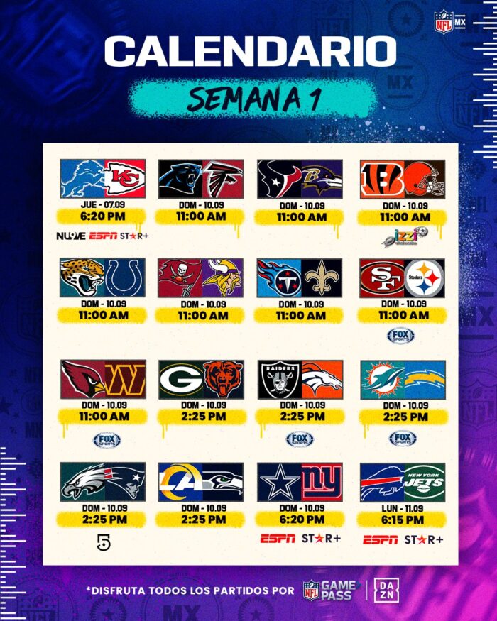 La nueva temporada de la NFL comenzarán este jueves a las 18:20 horas, tiempo del centro de México, con el duelo entre los campeones Kansas City y Detroit en el Arrowhead Stadium.