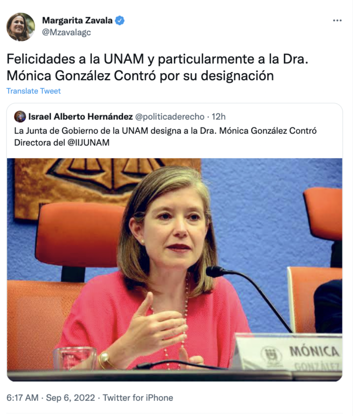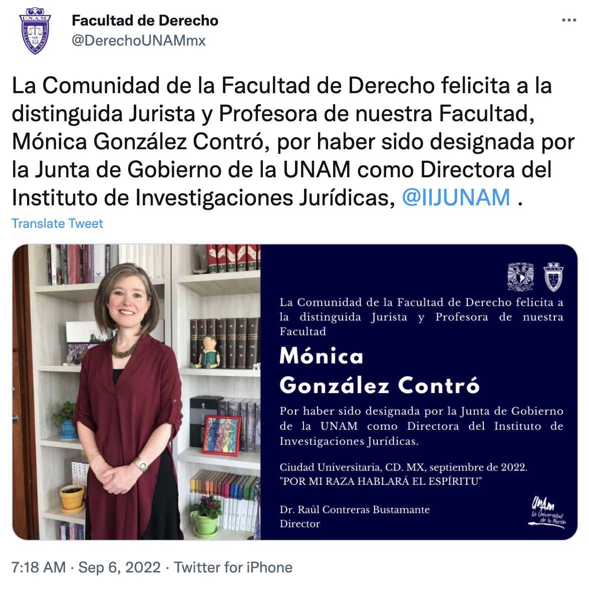 A través de su cuenta social en Twitter, y en nombre de la comunidad estudiantil, la Facultad de Derecho dio a conocer el nombramiento de Mónica González Contró, como Directora del Instituto de Investigaciones Jurídicas de la Universidad Nacional Autónoma de México (IIJUNAM).
