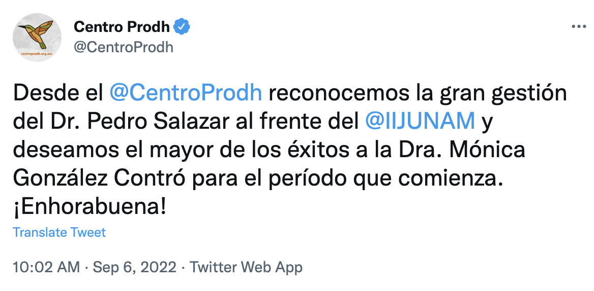 En tanto el Centro de Derechos Humanos Miguel Agustín Pro Juárez (Centro Prodh) deseó “el mayor de los éxitos” a la también promotora de los derechos humanos, en especial de niñas, niños y adolescentes, González Contró; aprovechó para reconocer “la gran gestión” de su predecesor, el Dr. Pedro Salazar, durante la dirección del centro de investigaciones académico.