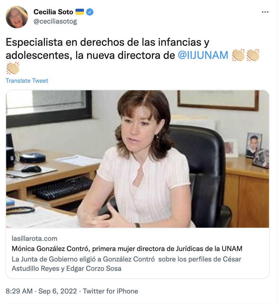 De igual forma, la feminista mexicana Cecilia Soto González, se mostró entusiasta con el nombramiento de la Abogada General de la UNAM (2015-2020), al compartir el mensaje acompañado con emoticones aplaudiendo.