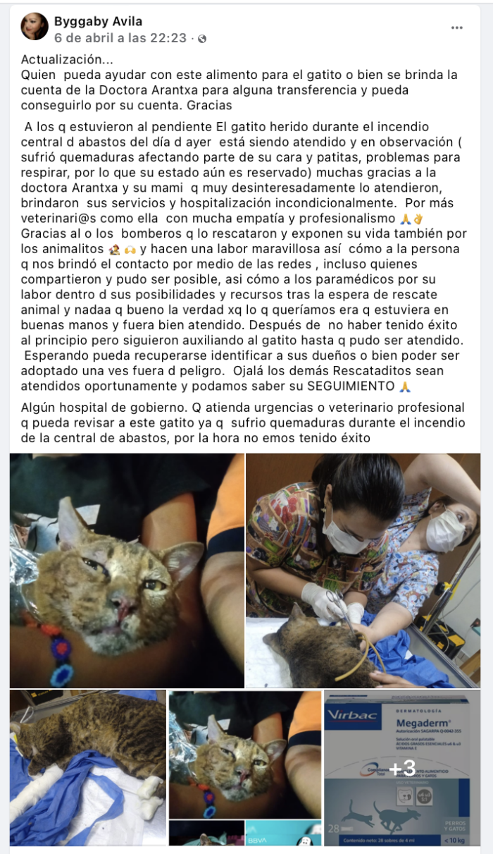 El gatito que fue rescatado del incendio en la Central de Abasto localizada en la alcaldía Iztapalapa de la Ciudad de México (CDMX) se encuentra en estado delicado de salud.