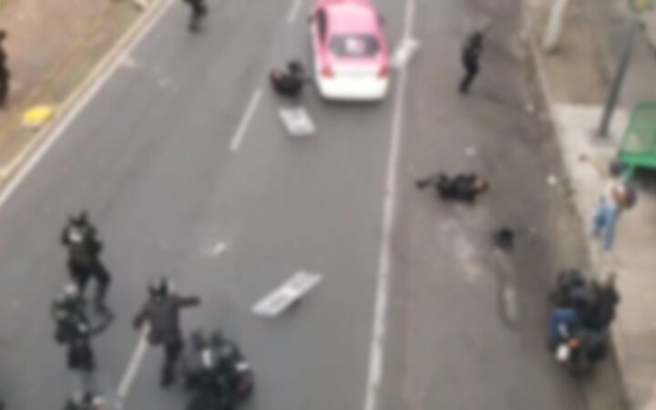En otro clip, tomado desde lo alto de un puente peatonal, se observa a un vehículo color rosa con blanco -colores oficiales para los taxis de la capital- embestir a al menos tres policías capitalinos para luego darse a la fuga.