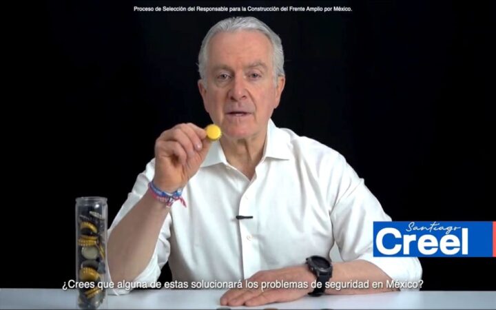 “¿Crees que alguna de estas solucionará los problemas de seguridad en México? No; ¿En educación? No; ¿En salud? Menos; ¿En economía? Tampoco”, señala Creel, y después vacía el frasco lleno de corcholatas a la basura.