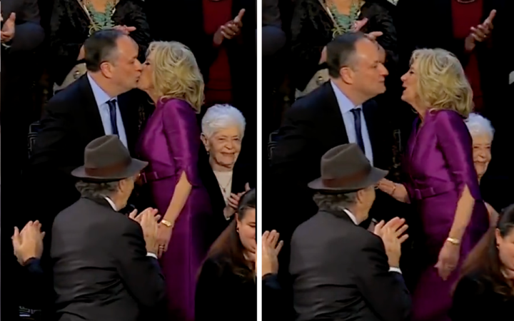 Con una ovación, Jill Biden tomaba camino a la grada preferente, no sin antes saludar al marido de la vicepresidenta de los Estados Unidos con lo que parece ser un beso en la boca.
