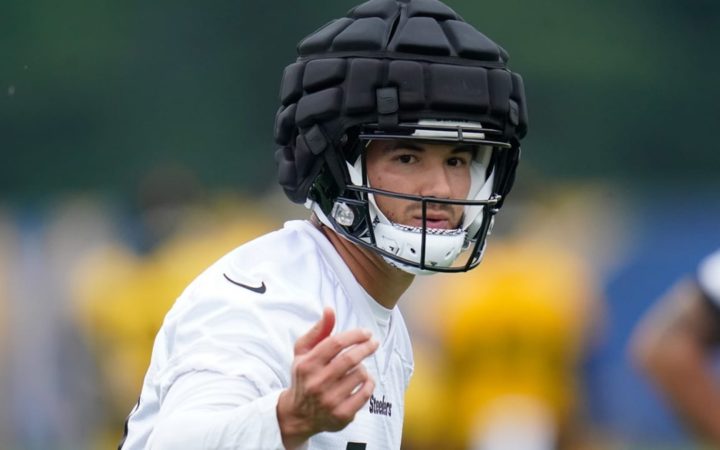 Steelers quarterback Kenny Pickett drops back to pass while wearing a Guardian Cap during the first day of minicamp Tuesday at UPMC Rooney Sports Complex. pic.twitter.com/j4PJDvGfwX