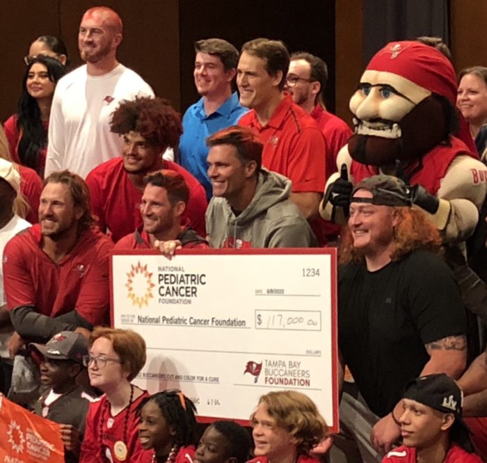 Tom Brady, mariscal de campo de los Bucaneros de Tampa Bay, prestó su cabello como lienzo para niños sobrevivientes de cáncer como parte del “Cut and Color for a Cure”, evento de recaudación de fondos para la lucha contra el cáncer pediátrico que organiza el equipo de Florida cada año.
