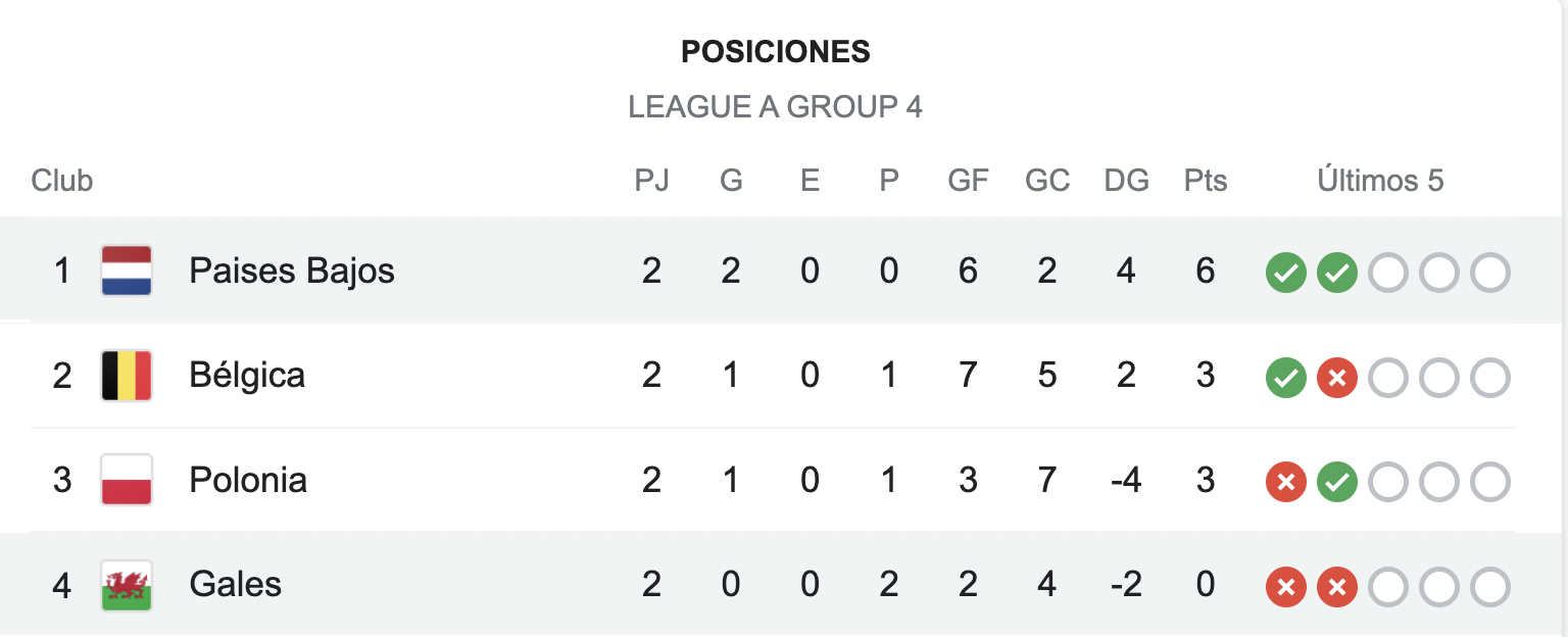 De esta forma, Bélgica se coloca segunda del sector con 3 puntos, empatada con Polonia; mientras, Países Bajos lidera con pleno de triunfos y Gales ocupa la última posición todavía con cero.