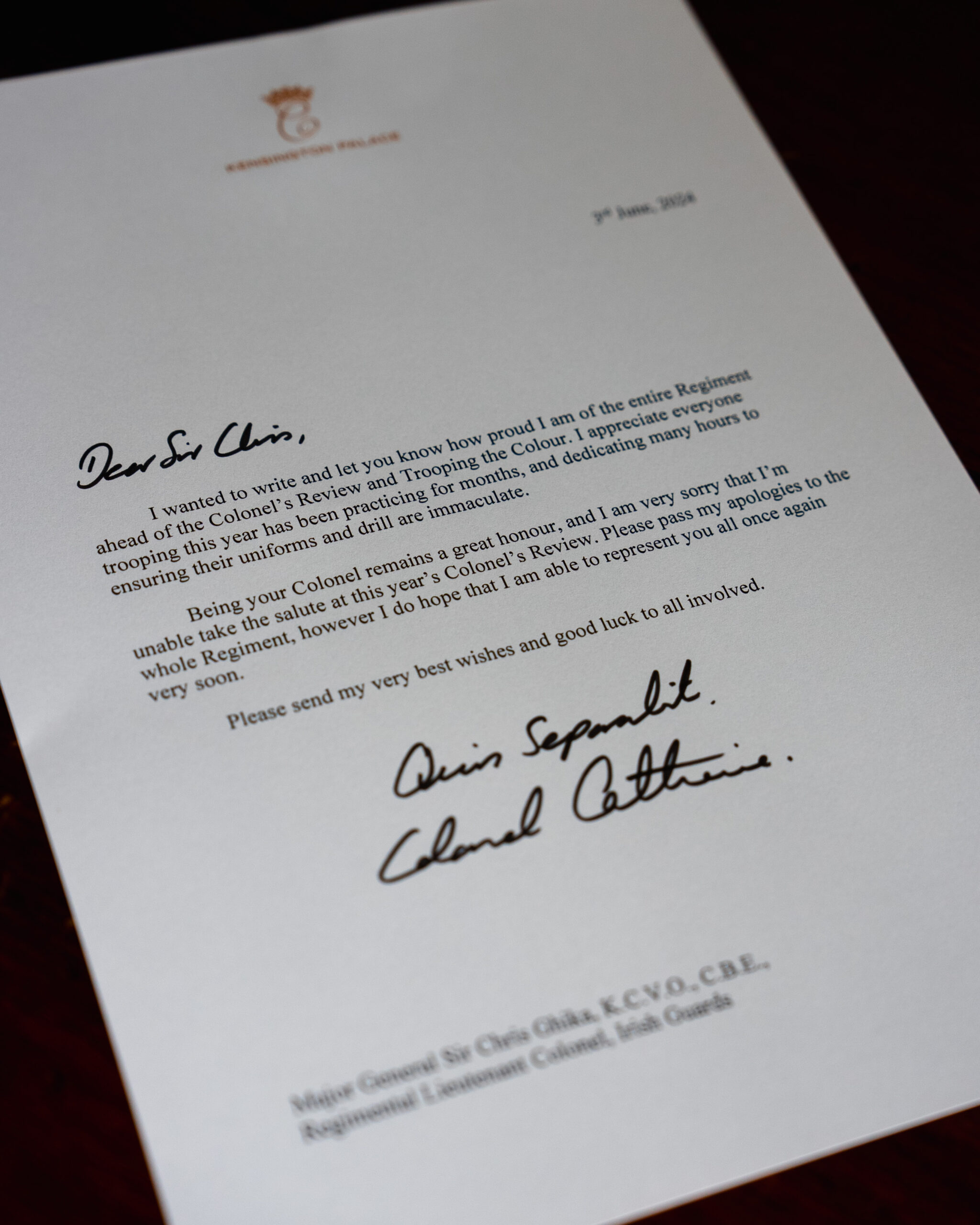 Kate Middleton, quien se encuentra apartada de los compromisos oficiales debido al cáncer que padece, escribió una carta a la Guardia Irlandesa -uno de los regimientos a pie del Ejército británico- para “disculparse” por no poder estar este sábado en un acto militar celebrado en Londres.