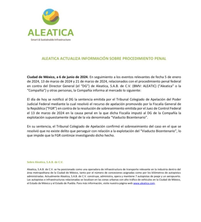El texto informa que, en seguimiento al procedimiento legal federal en contra del Director General de Aleatica y otras personas, el Tribunal resolvió la apelación promovida por la Fiscalía General de la República en contra de la resolución de sobreseimiento emitida por el Juez de Control en marzo en la causa penal que imputaba al Director General de la compañía de explotación supuestamente ilegal del Viaducto.