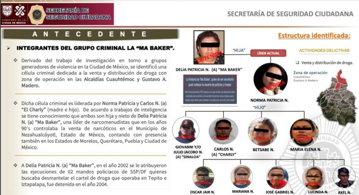 El Secretario de Seguridad Ciudadana (SSC), Omar García Harfuch, explicó que esta célula criminal estaba encabezada por Norma Patricia, hija de “Ma Baker”, y Carlos “N”, alias “Charly”, hijo de Norma Patricia y nieto de “Ma Baker”, los cuales dirigían las operaciones de ese grupo criminal en las alcaldías Cuauhtémoc y Gustavo A. Madero.