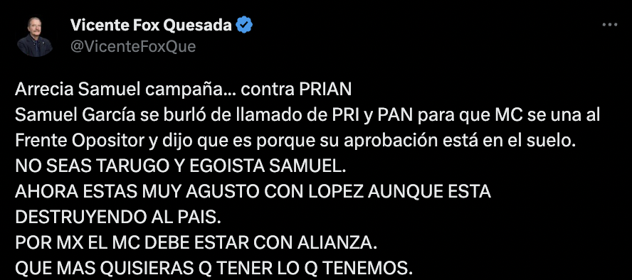 “NO SEAS TARUGO Y EGOISTA SAMUEL. AHORA ESTAS MUY AGUSTO CON LOPEZ AUNQUE ESTA DESTRUYENDO AL PAIS. POR MX EL MC DEBE ESTAR CON ALIANZA. QUE MAS QUISIERAS Q TENER LO Q TENEMOS”, se lee en su tuit.