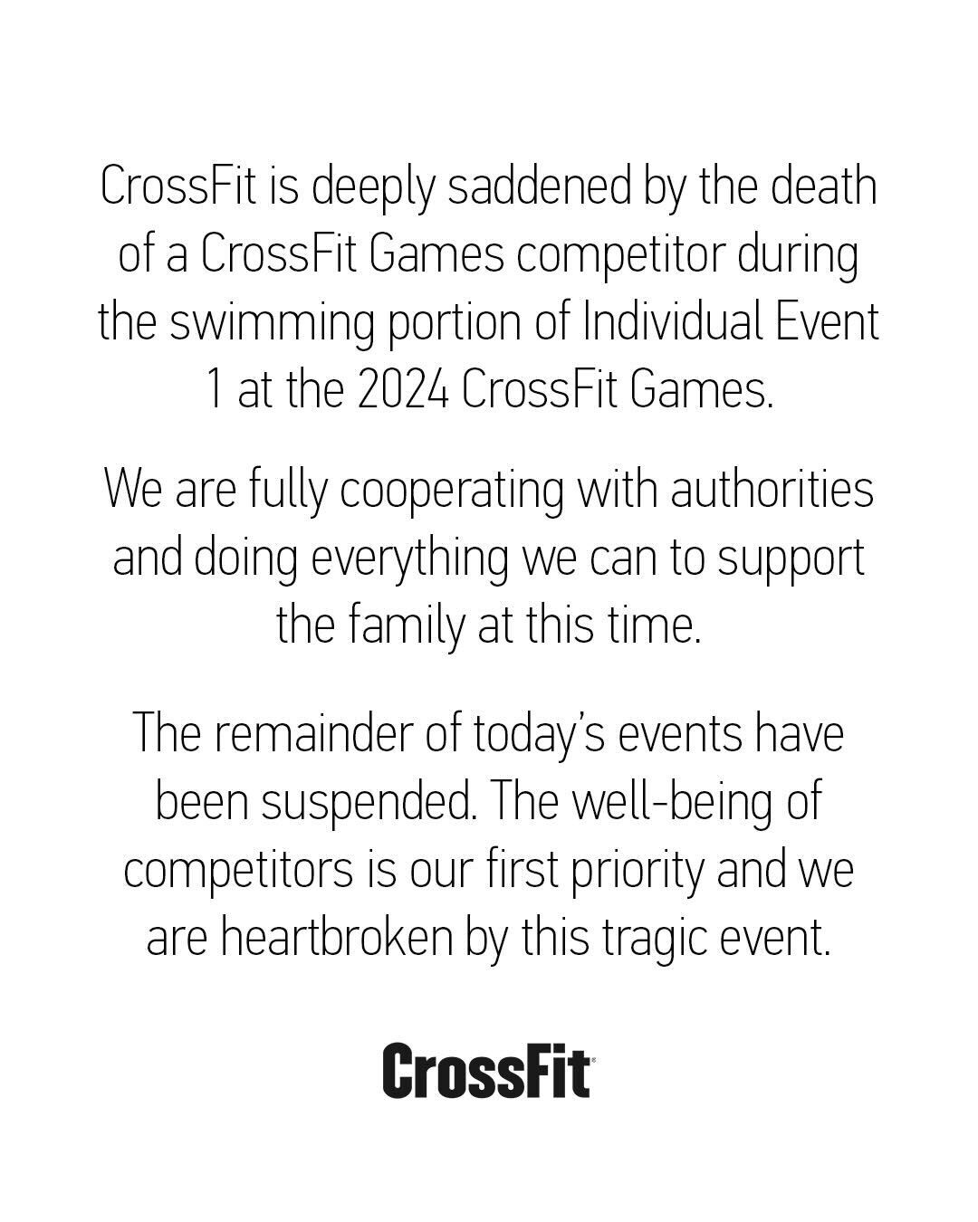CrossFit está profundamente entristecido por la muerte de un competidor de los CrossFit Games durante la porción de nado en el evento individual 1.
