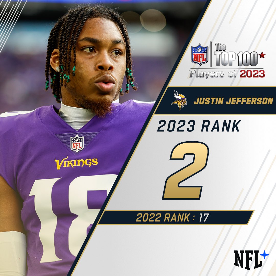 Justin Jefferson, receptor de los Vikingos de Minnesota, ocupó la posición dos en las votaciones de los 100 mejores jugadores 2023. El receptor de 24 años nacido en St. Rose, Louisiana, fue líder en yardas por recepción con mil 809 en 2022, temporada en la que fue reconocido como Mejor Ofensivo del año.
