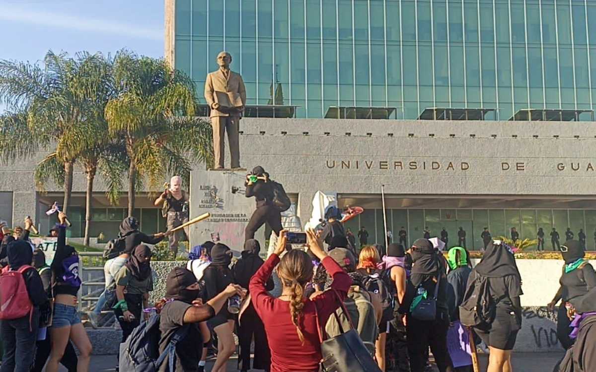 También marcharon en Guadalajara, donde se calculó la participación de 70 mil manifestantes quienes además de las consignas constantes de violencias contra las mujeres, sumaron las agresiones y acoso denunciadas en la Universidad de Guadalajara, señalando a docentes, y trabajadores de la institución.